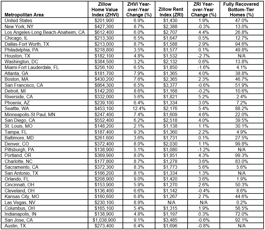 “The housing market as a whole is moving at a steady clip, with high demand and low inventory combining to maintain strong home value appreciation,” says Dr. Svenja Gudell, chief economist at Zillow. “Most new construction has been at the higher end of the market, so demand for the limited supply of entry-level homes is pushing up their values—but these homes also lost more value when the bubble burst. Many of these homeowners are still waiting to see their homes come back to where they were about 10 years ago. Even as headline numbers show an overall recovery, there are still thousands of Americans struggling to bounce back from the housing bust.”