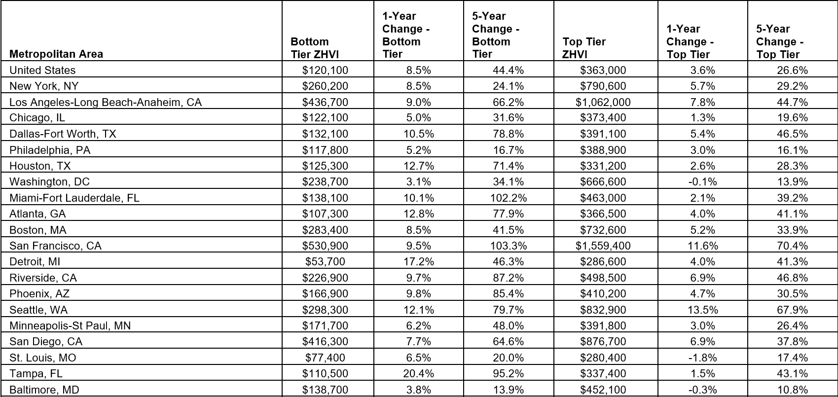 The areas that have appreciated the most in the starter tier are Las Vegas, Nev. (+104.4 percent in the last five years), San Francisco, Calif. (+103.3 percent), Miami-Ft. Lauderdale, Fla. (+102.2 percent), Sacramento, Calif. (+101 percent) and Tampa, Fla. (+95.2 percent). Entry-level homeowners have gained the most equity in the past year in Tampa, Fla. (+20.4 percent), Las Vegas, Nev. (+19.9 percent), San Antonio, Texas (+18.4 percent), San Jose, Calif. (+18 percent), and Detroit, Mich. (+17.2 percent).
