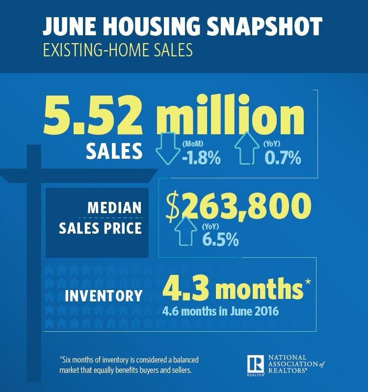 Existing-home sales totaled 5.52 million, a 1.8 percent decrease from May but a 0.7 percent increase from one year prior. Inventory decreased 0.5 percent to 1.96 million, 7.1 percent below one year prior.