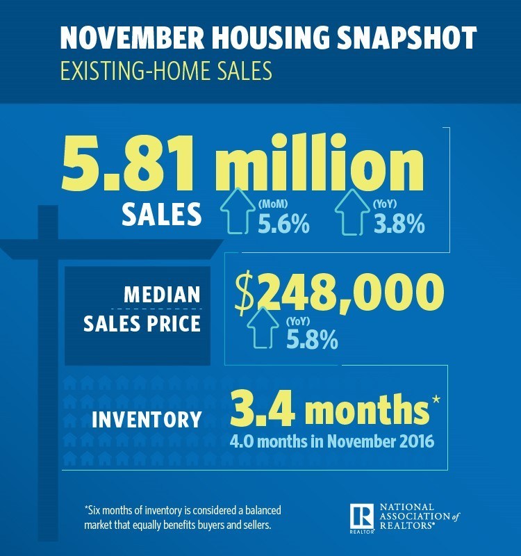 Existing-home sales totaled 5.81 million, a 5.6 percent increase from October and a 3.8 percent increase from one year prior. Inventory decreased 7.2 percent to 1.67 million, 9.7 percent below one year prior.