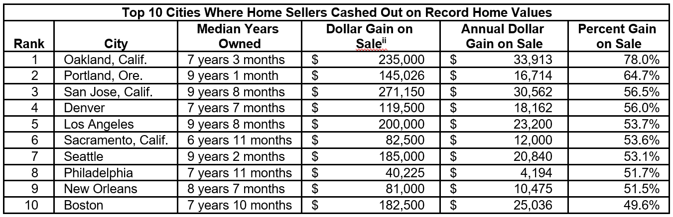 Sellers on the West Coast—where home prices have rocketed since the recession—saw higher returns, with those in Oakland, Calif., taking home the most at 78 percent, or $235,000.