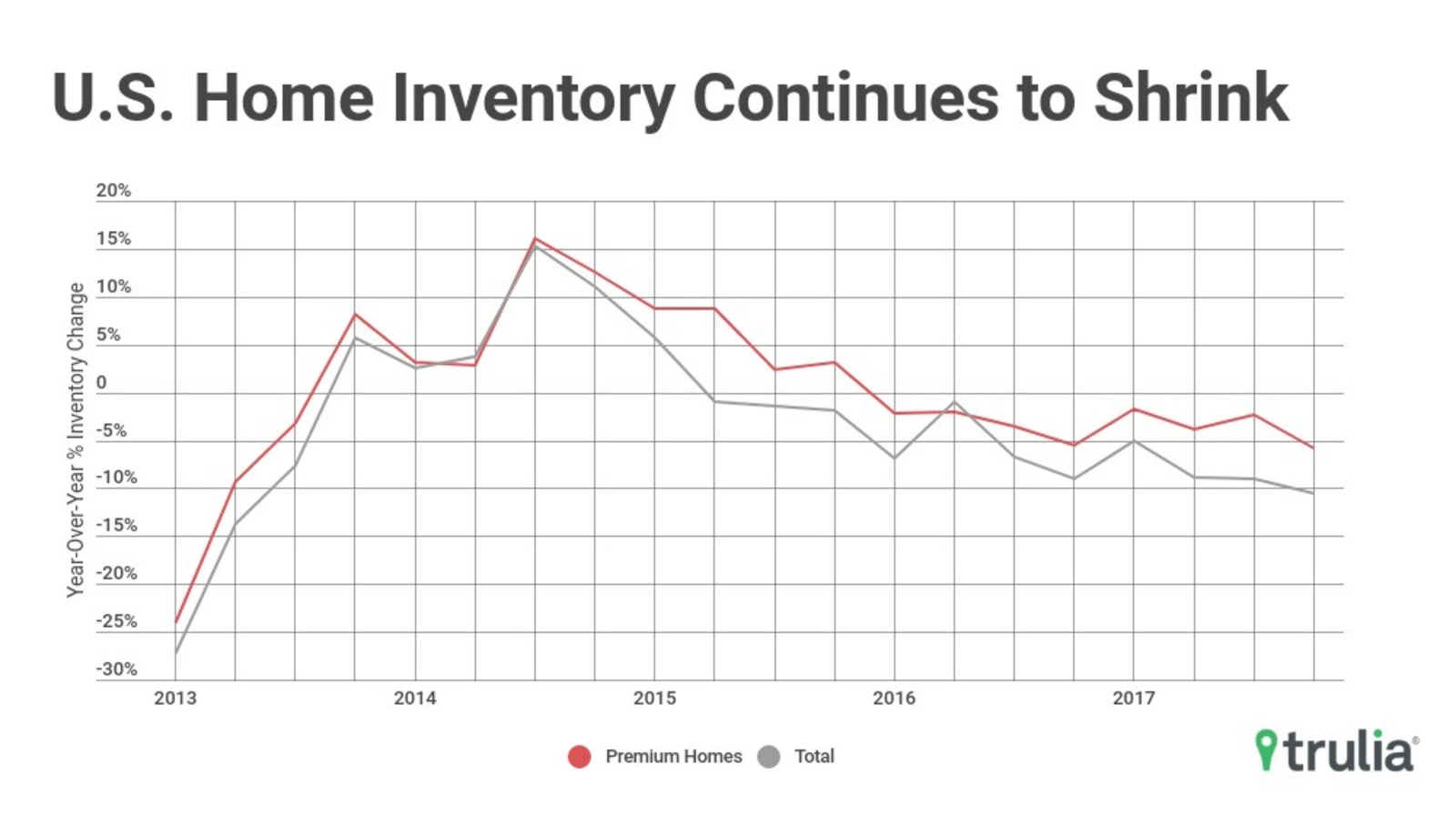 Housing inventory is shrinking, still, according to the recently released Trulia Inventory and Price Watch for the fourth quarter of 2017. Across the board, in the premium, starter and trade-up tiers, inventory has tumbled 10.5 percent year-over-year—the most considerable drop-off since 2013.