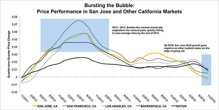 Home prices in San Jose, Calif.—one of the nation’s leading markets since the bust—posted negative 0.3 percent last quarter, marking the area’s first foray into the red in five years with currently the lowest quarterly growth rate in the country, according to Clear Capital’s recent Home Data Index (HDI) Market Report. With the San Jose area leading price movement in California, is the bubble out West about to burst?