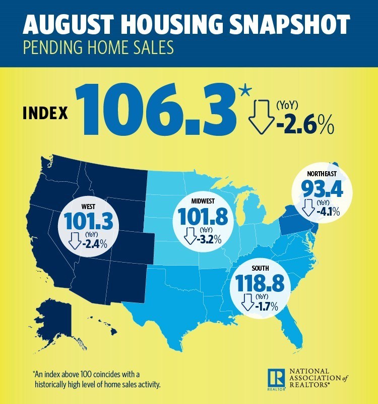 “August was another month of declining contract activity because of the one-two punch of limited listings and home prices rising far above incomes,” says Lawrence Yun, chief economist at NAR. “Demand continues to overwhelm supply in most of the country, and, as a result, many would-be buyers from earlier in the year are still in the market for a home, while others have perhaps decided to temporarily postpone their search.”