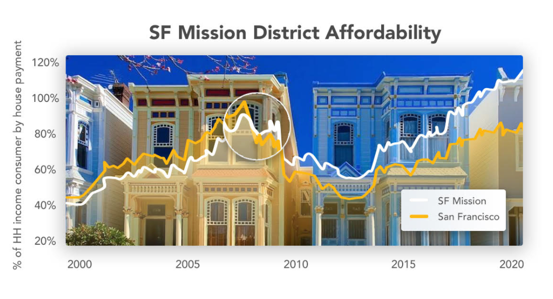 The popular Mission District in San Francisco hasn’t seen 40 percent since the year 2000, when it was gritty, unsafe and actually more affordable than the rest of the city. A trickle of affluent residents turned into a flood in 2008, and affordability flipped. Since then, the gap has widened, with 100 percent affordability (completely unaffordable) in the Mission versus 75 percent in the broader San Francisco metropolitan statistical area (MSA).