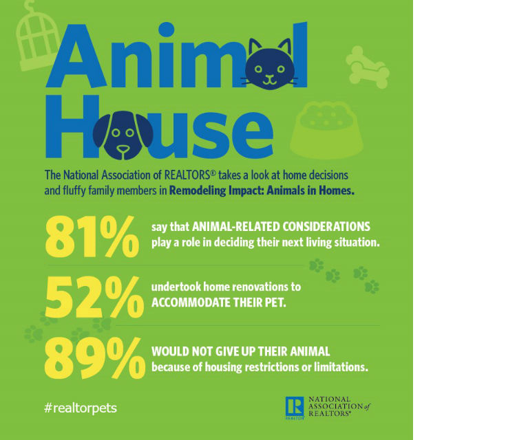 According to NAR’s 2017 Animal House: Remodeling Impact report, 99 percent of pet owners said they consider their animal part of the family, and 89 percent of those surveyed said they would not give up their animal because of housing restrictions or limitations. In fact, 12 percent of pet owners have actually moved in order to accommodate their furry, finned or feathered family member, and 19 percent said they would consider moving to accommodate their animal in the future.